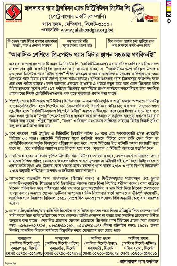 | ২৪ | "প্রি-পেইড গ্যাস মিটার সংক্রান্ত জনসচেতনতামূলক বিজ্ঞপ্তি” | |