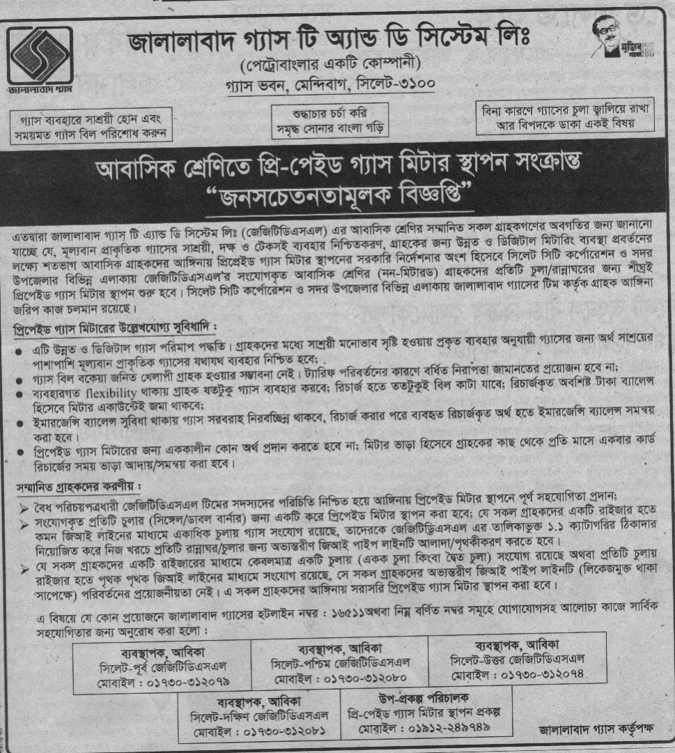 | ১৬ | “প্রি-পেইড গ্যাস মিটার সংক্রান্ত জনসচেতনতামূলক বিজ্ঞপ্তি” | |